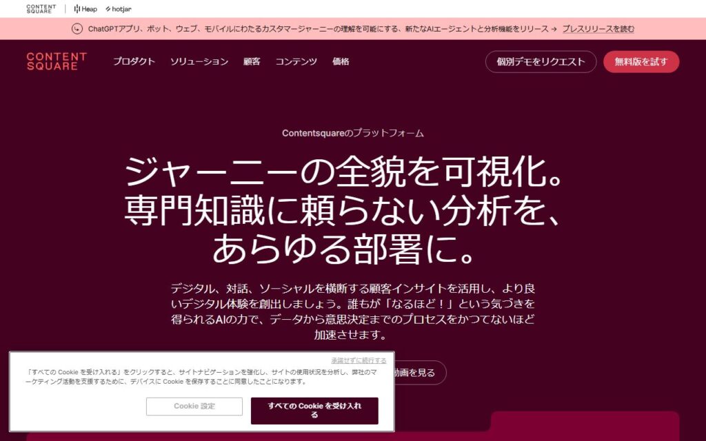 Contentsquare Japan合同会社は、デジタル顧客体験分析プラットフォームを提供するグローバルリーダーの日本法人です。Webサイト・モバイルアプリ・AIエージェントを横断するカスタマージャーニーを可視化し、AIを活用したユーザー行動分析でコンバージョン率の改善を支援しています。東京都千代田区に拠点を置いています。