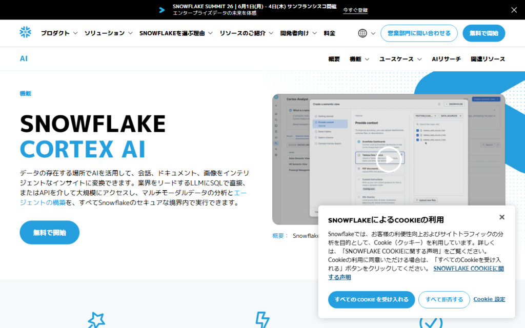 Snowflake合同会社は、クラウドデータプラットフォームを提供するグローバル企業の日本法人です。データウェアハウス、データレイク、データエンジニアリング、データサイエンスを単一のプラットフォームで統合し、企業のデータ活用を包括的に支援しています。AI・ML機能を統合したSnowflake Cortex AIにより、データウェアハウス上で直接LLMを活用した分析・検索・ガードレール機能を利用できる環境を提供しています。世界中で数千社を超える企業が導入しており、金融・ヘルスケア・小売・テクノロジーなど幅広い業界で活用されています。