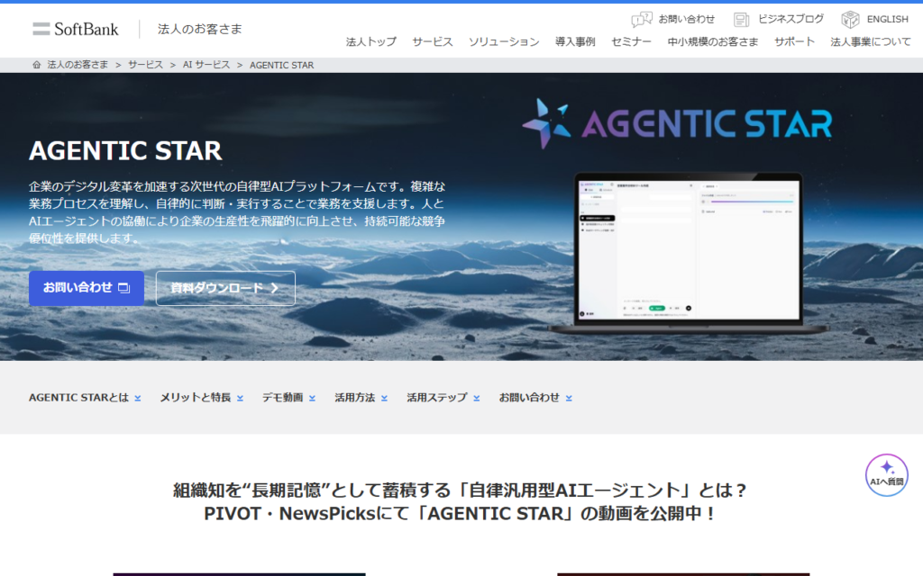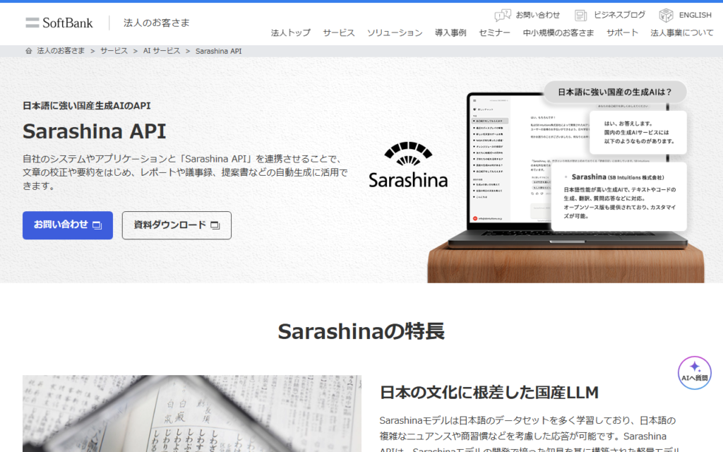ソフトバンク株式会社は、日本を代表する通信・テクノロジー企業であり、AI領域においても幅広いサービスを展開しています。国産大規模言語モデル「Sarashina API」による文章生成・要約・校正機能の提供をはじめ、Azure OpenAI Serviceの導入支援、GPUサーバーを備えたAIデータセンターの運営を手掛けています。企業向けにはAI定着化支援やアノテーションサービス「TASUKI」シリーズ、AIエージェント「AGENTIC STAR」などを提供し、AI人材育成プラットフォーム「Axross Recipe for Biz」も展開しています。SB Intuitionsとの連携による国産LLMの研究開発にも注力しています。