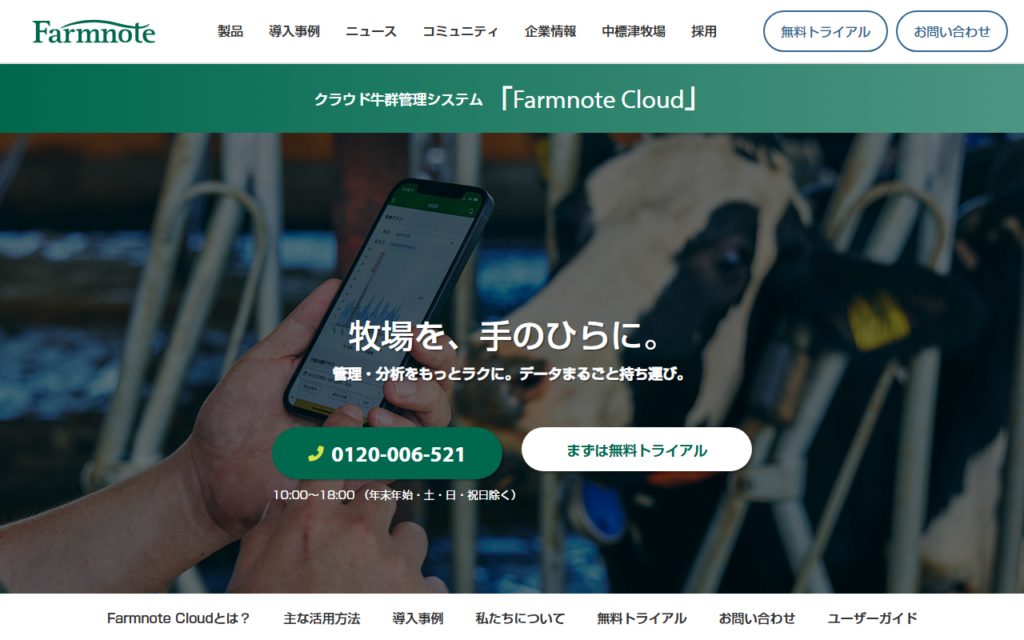 Farmnote Cloudは、酪農・畜産経営のためのクラウド牛群管理システムです。乳用牛の搾乳・繁殖成績管理、肉用牛の出荷・肥育成績管理など、すべての経営形態に対応しています。AIが牛個体の行動データから状態を見える化し異常を検知します。 有償契約頭数... -