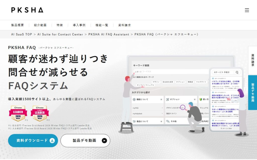 PKSHA FAQは、株式会社PKSHA Technologyが提供する導入実績1,500サイト以上を持つナレッジマネジメント型FAQシステムです。キーワード検索・カテゴリ・タグ・サジェスト・ランキング表示など豊富な探索機能でユーザーが必要な情報に素早くたどり着けます。... -