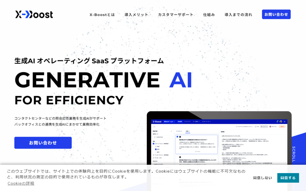 X-Boost(クロスブースト)は、Gen-AX株式会社が提供するコンタクトセンター・バックオフィス向けの生成AIオペレーティングSaaSプラットフォームです。オペレーターが問い合わせ内容を入力すると、社内マニュアルやFAQなどの大量データをRAG技術で高速に検... -