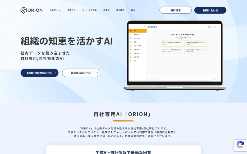 株式会社SparkPlusが提供する「ORION」は、あらゆる社内データを横断して瞬時に回答・提案を行う統合型AIエージェントです。PDF・Word・Excel・画像・グラフなど多様なフォーマットのドキュメントを処理でき、独自のLLMオーケストレーション機構により製造... -
