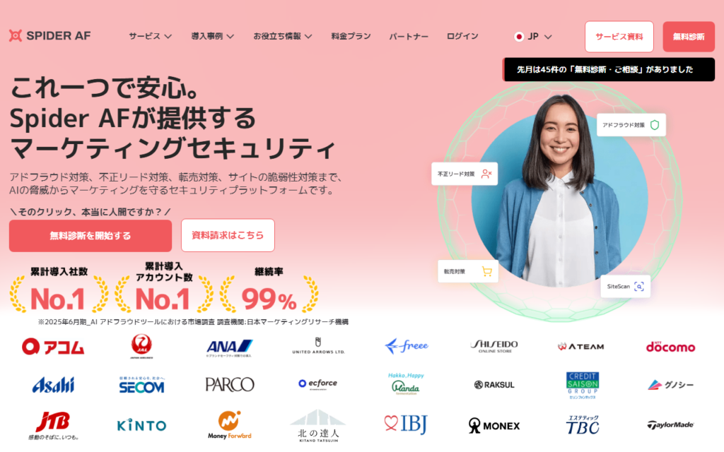 Spider AFは、AIを活用した国内最大級のアドフラウド(広告不正)対策ツールです。デジタル広告出稿時に発生する不正クリックや無効トラフィックを自動で検知・ブロックし、広告費の無駄を削減します。 「Spider AF PPC」はアドフラウド検知・ブロック、「... -
