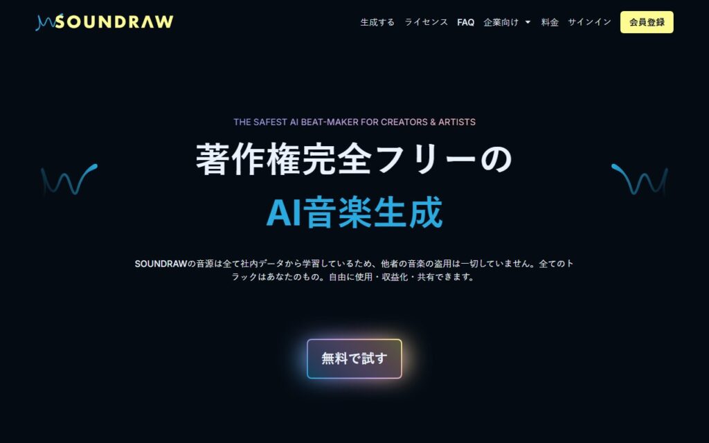 SOUNDRAWは、AIによる自動作曲サービスです。ムードやジャンル、曲の長さを選ぶだけでAIが複数の楽曲を自動生成します。生成された楽曲はテンポや構成を自由にカスタマイズでき、動画BGMやゲーム音楽などに最適な楽曲を数分で制作できます。 自社制作の音... -