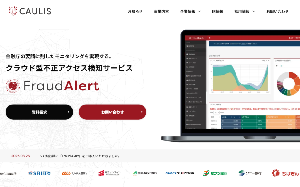 Fraud Alertは、法人向けの不正アクセス検知サービスです。200以上の要素から「本人らしさ」を機械学習でリアルタイムに判定し、不正ログイン試行を未然に検知します。 入出金モニタリングサービス「Fraud Alert 入出金検知」も正式リリースされています。... -