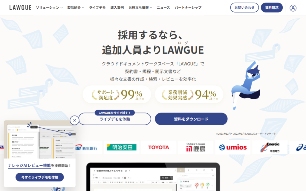 LAWGUEは、AIを搭載したクラウドドキュメントワークスペースです。契約書や規程類などの構造化文書をパーツ単位で検索・再利用できる仕組みにより、文書作成業務を大幅に効率化します。 AI検索・サジェストエンジンにより過去の文書資産から最適な文例を提... -
