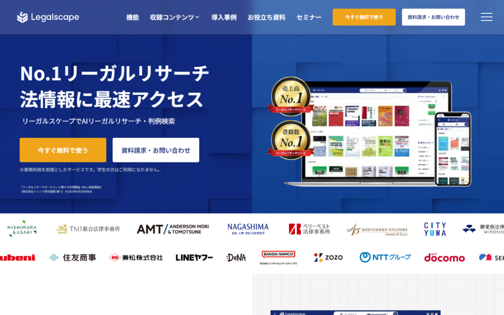 Legalscapeは、株式会社Legalscapeが提供する自然言語処理と生成AIを組み合わせた企業法務・法律事務所向けのAIリーガルリサーチ・判例検索プラットフォームです。業界最大級のコンテンツとして法律書籍3,500冊以上・計35,000件超を搭載しており、質問文を... -