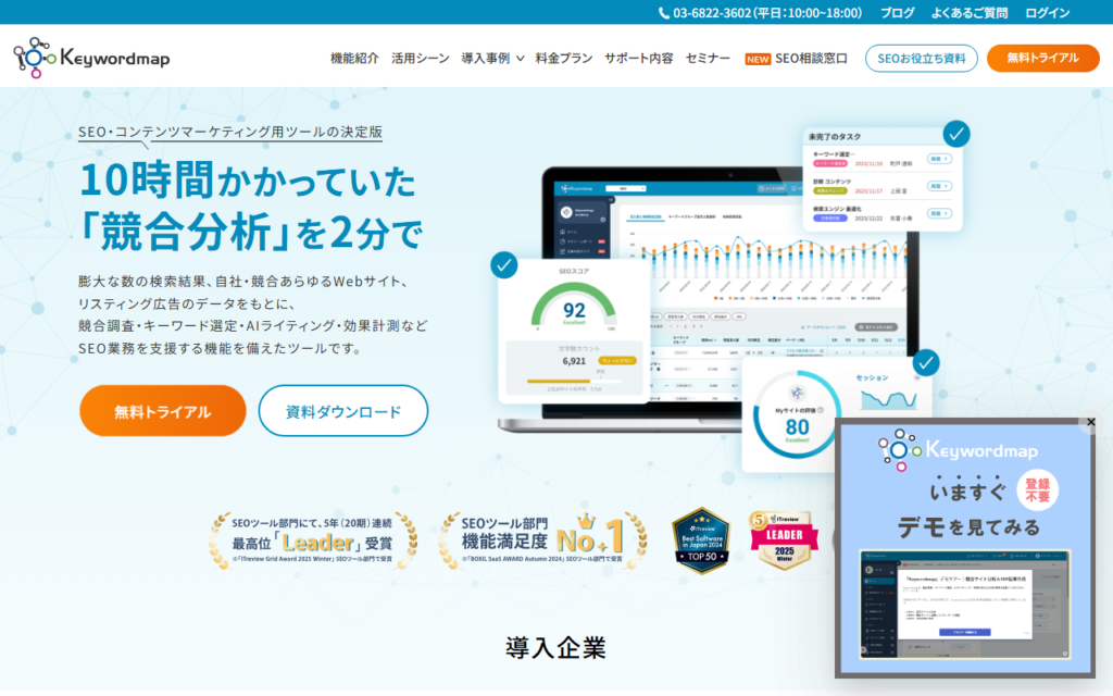 Keywordmapは、膨大な検索結果データ・Webサイトデータ・リスティング広告データをもとに、SEO・コンテンツマーケティングを包括的に支援するSaaSツールです。自然言語処理技術とAIを活用しています。 AI Overviewsモニタリング機能やAIライティングを効率... -