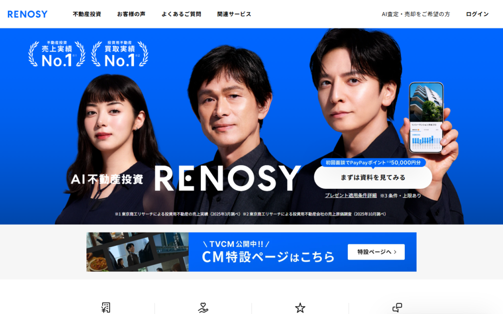 RENOSYは、AIを活用した不動産投資サービスで、物件の購入・管理・売却をワンストップで提供しています。豊富なデータとAIで資産価値の高い物件を厳選し、月々1万円程度から始められる不動産投資を実現します。 AI査定機能により確度の高い価格査定を実施... -