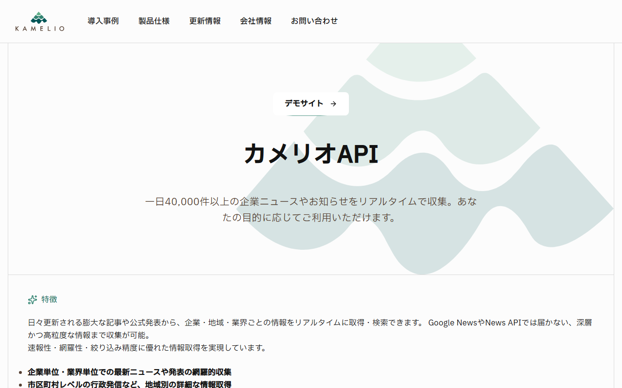 | 企業概要 | AIニュース検索エンジン「カメリオAPI」で1日4万件超の企業ニュースをリアルタイム収集・検索可能にする企業。 |