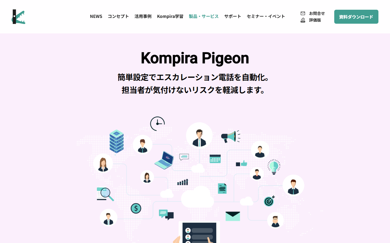 Kompira Pigeonは、24時間稼働サービスにおけるエスカレーション電話を自動化するシステムです。サービスごとに電話の順番・番号・ループ回数などの通知フローを自由に設定でき、一人目の担当者が応答しない場合は自動的に次の担当者へコールします。プッシュボタンによるフロー制御や対応履歴の記録機能も備えています。ZABBIXやServiceNowなど複数の監視ツールとの連携にも対応しています。