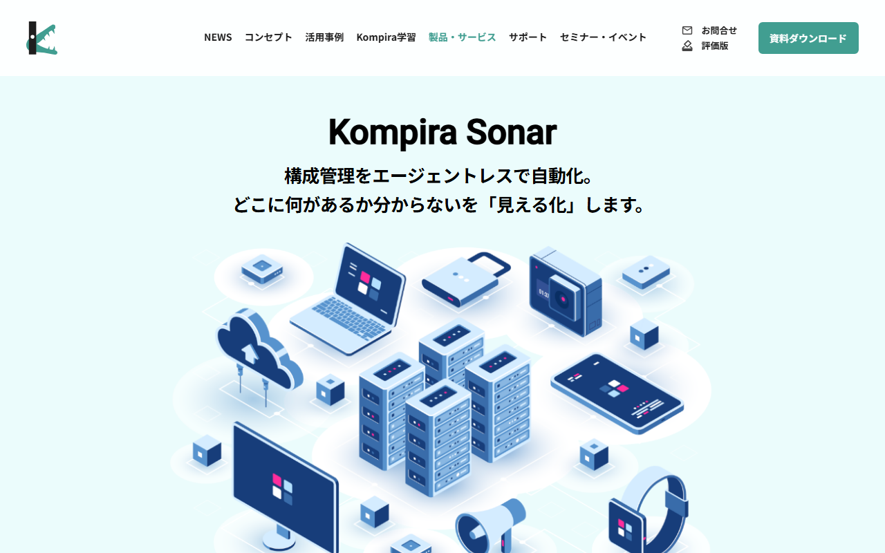 Kompira Sonarは、構成管理をエージェントレスで自動化するプラットフォームです。専用ゲートウェイをインストールするだけで、IPリーチャブルな範囲の構成情報を自動取得し、物理サーバからアプリケーション情報まで一元管理します。オンプレミスとクラウド環境の両方に対応し、未知ノードの自動検出機能も搭載しています。IT資産管理やセキュリティ対策に課題を抱える企業を対象としています。