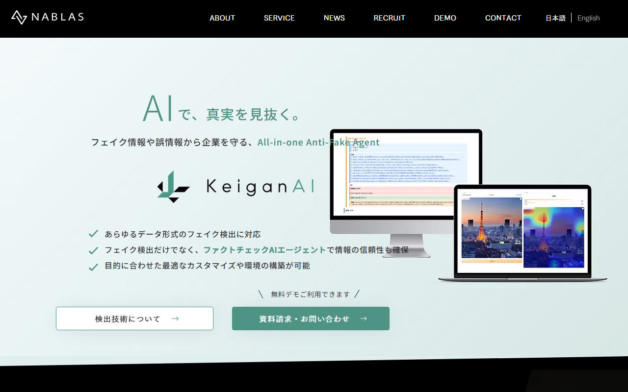 KeiganAIは、NABLAS株式会社が提供するAIソリューションです。独自のAI技術を活用し、企業が抱えるさまざまな課題に対してAIによる解決策を提供します。画像認識や自然言語処理などの先端技術を応用し、業務プロセスの自動化や高度なデータ分析を可能にします。製造業やサービス業をはじめとする幅広い業種の企業を対象としており、導入企業の課題やニーズに合わせた柔軟なカスタマイズにも対応しています。