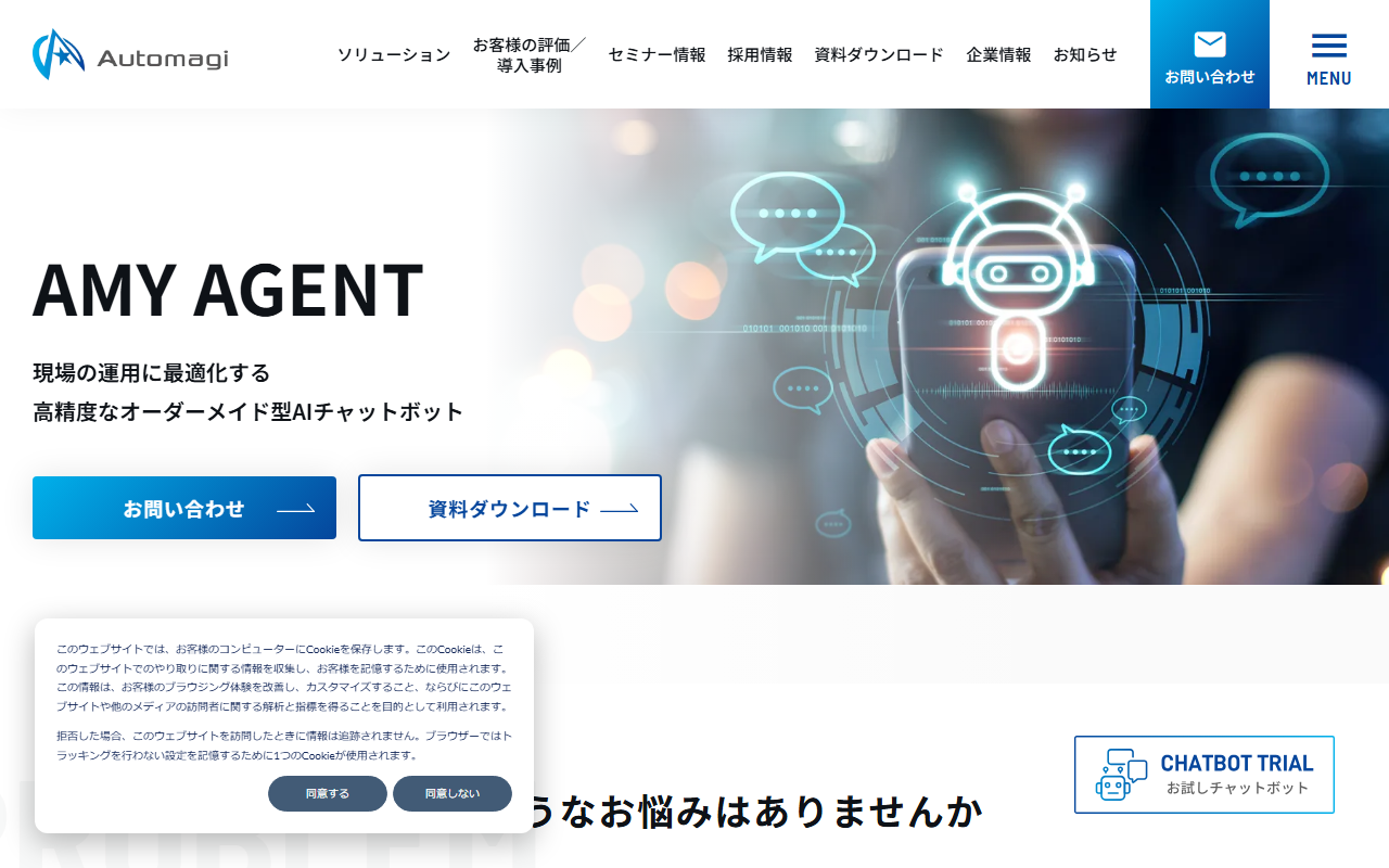 AMY AGENTは、現場の運用に最適化された高精度なオーダーメイド型AIチャットボットです。企業ごとの特定のニーズや業務フローに合わせたカスタマイズに対応し、汎用的なチャットボットでは実現が難しい専門的な顧客対応を可能にします。金融機関やサービス業など高品質な顧客対応が求められる企業を対象としており、りそなグループや松井証券などでの導入実績があります。