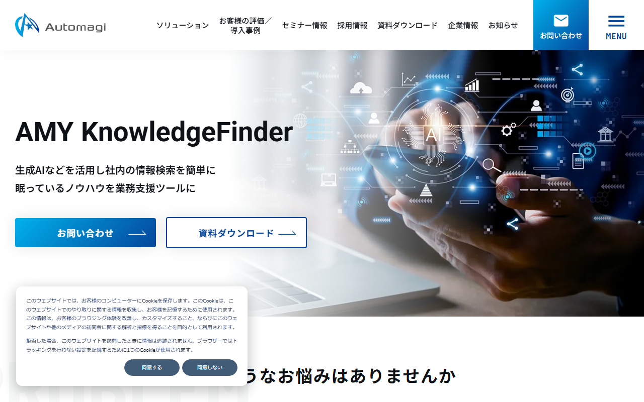 AMY KnowledgeFinderは、生成AIを活用して社内の情報検索を効率化するソリューションです。社内に散在するドキュメントやマニュアルを横断的に検索し、自然言語での質問に対して関連性の高い情報を提示します。社内に膨大な情報資産を持ちながら活用しきれていない企業を対象としており、ナレッジの有効活用による業務効率化と属人化の解消を支援します。