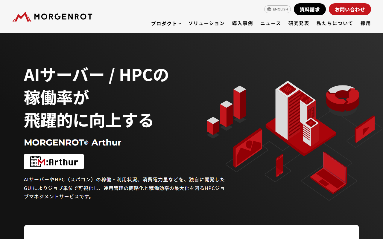 MORGENROT Arthurは、AIサーバーやHPCの運用管理を支援するジョブマネジメントツールです。独自GUIにより、ジョブ単位での稼働状況・利用状況・消費電力量を可視化し、運用管理の簡略化と稼働効率の最大化を実現します。AIデータセンターの運営企業やHPCを運用する研究機関・大学が主な対象です。