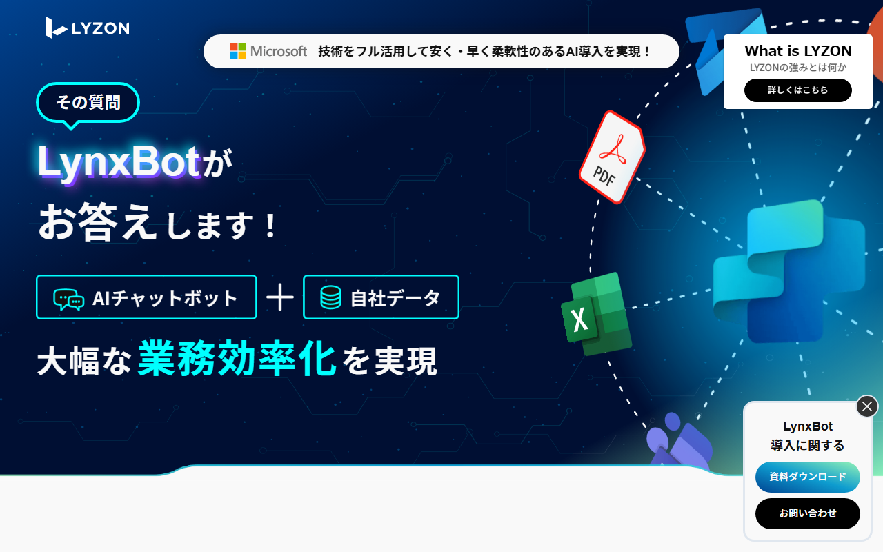 LynxBotは、RAG技術を活用した社内データ連携型AIチャットボットです。SharePoint上のExcel、Word、PowerPoint、PDFを自動学習し、事前にFAQを用意することなくフリーフォームの質問への回答が可能です。Microsoft Copilot StudioとAzure OpenAI Serviceを基盤としており、社内イントラネットへの設置やヘルプデスク業務の負担軽減に活用されています。Office 365を導入している企業が対象となっています。