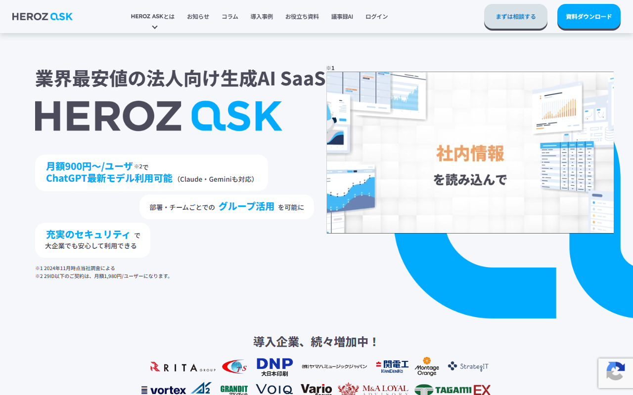 HEROZ株式会社が提供する「HEROZ ASK」は、ChatGPT・Claude・Geminiなどの複数AIモデルを企業の業務に安全に活用できる法人向け生成AIプラットフォームです。目的別AIアシスタントを無制限に作成でき、部署・グループ単位のアクセス権限管理や引用元ファイルの参照機能によりハルシネーション対策も備えています。ISO27001認証取得済みのAzure基盤を採用し、会話内容が学習に利用されない高セキュリティ環境を提供します。