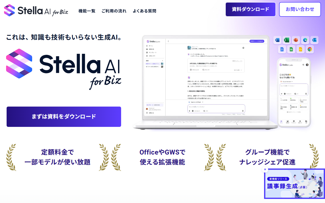 Stella AI for Bizは、株式会社SUPERNOVAが提供する法人向け生成AIプラットフォームです。Grok、Claude、Geminiなど複数の最新AIモデルを従業員全員が使い放題で利用でき、チーム間で共有できるプロンプトテンプレートやRAGデータベースを搭載しています。会議録音・文字起こし・話者分離機能、Deep Research、画像生成にも対応しており、管理者向けの利用状況ダッシュボードも備えています。初期費用なし、最低1アカウントから開始可能です。