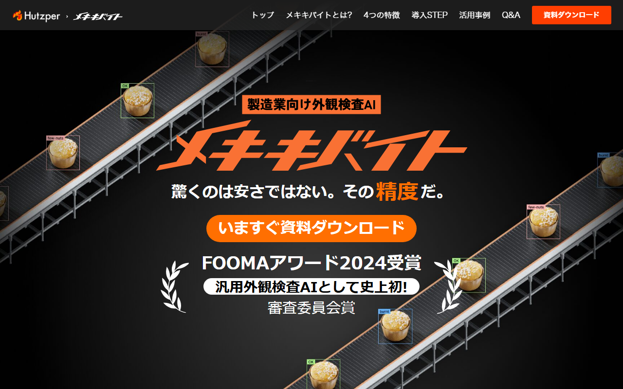 メキキバイトは、株式会社フツパーが提供する製造現場における目視外観検査業務をカメラとAIで自動化するシステムです。食品・半導体・電子部品・医療機器など幅広い製造業に対応し、光学設計から排除機構まで一貫してサポートします。月額制サブスクリプションによるスモールスタートが可能で、補助金活用や買い切りプランにも対応しています。導入後も「Hutzper Insight」による不良傾向の見える化や継続的なAI再学習支援を提供し、検査品質のばらつき解消・人手不足対応・生産性向上を実現します。