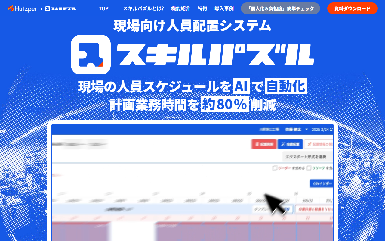 スキルパズルは、株式会社フツパーが提供する製造現場向けの人員配置最適化AIです。複雑な配置要件に対してAIが最適な人員配置を自動立案し、計画業務の工数を約80%削減します。習熟度評価や資格期限管理を含むスキル管理機能、シフト提出・管理機能、CSVインポートや他システム連携にも対応しています。属人化しがちな配置計画業務を標準化し、スキルの見える化により公平な人材育成を支援します。製造現場の管理者・人事部門が直感的に操作できるUIを採用しています。