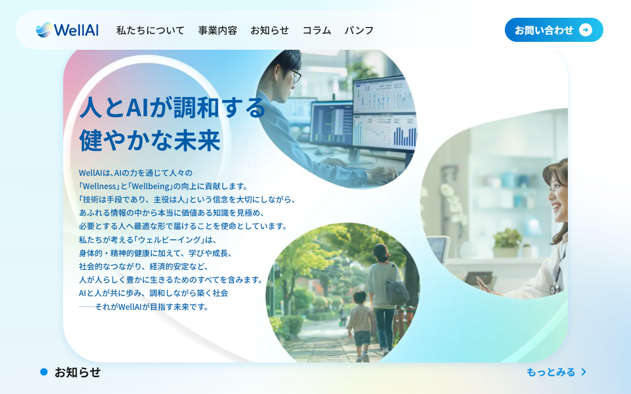 株式会社WellAIが提供する「MIRAI」は、企業が安全に生成AIを活用するためのセキュアAI基盤です。自己進化型AIアバターによる接客・案内の自動化、AIコールセンター機能による問い合わせ対応の効率化、法人向け生成AI研修プログラムなど、企業のAI活用を多角的に支援する統合プラットフォームとなっています。セキュリティを重視した設計で、企業内データの外部流出リスクを低減しながら生成AIの力を業務に活かすことができます。
