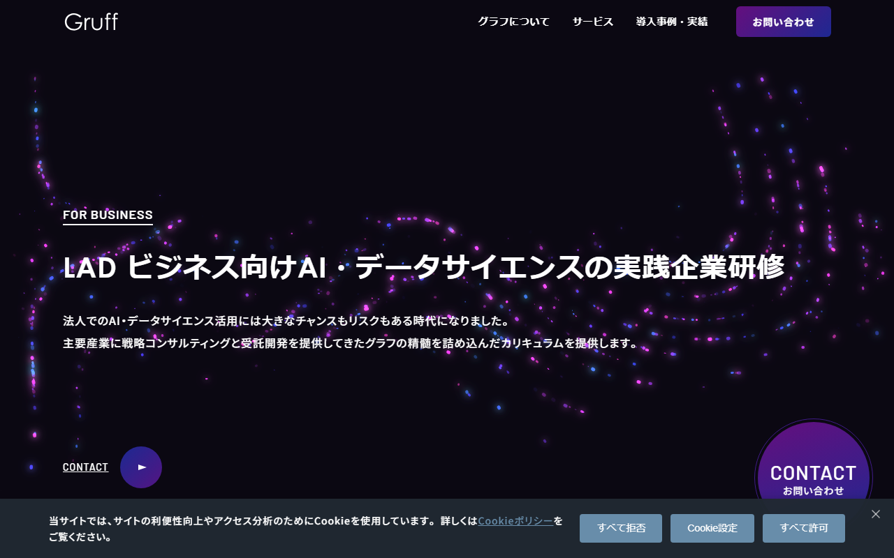 株式会社グラフが提供する「LAD」は、企業向けAI・データサイエンス実践研修プログラムです。生成AIやデータサイエンスを実務で活かせる人材育成を目的とし、ビジネス視点・データサイエンス技術・データエンジニアリングの3つのスキルを3日間・15セッションで学べる集中プログラムです。Pythonプログラミング、機械学習アルゴリズム、データ前処理、ビジネスケースへの応用を扱い、修了者には認定資格が付与されます。70社以上・250名超の受講実績を持ち、講義満足度は90%を誇ります。