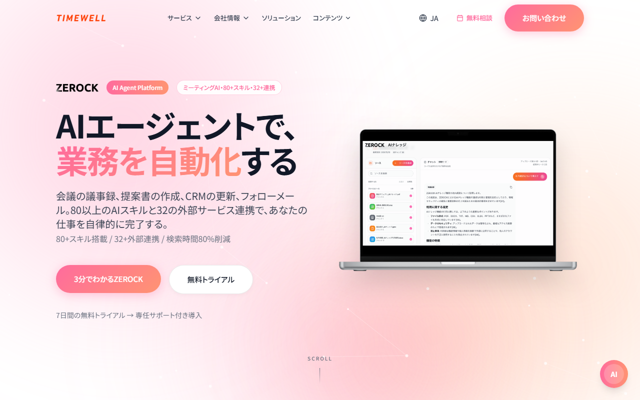 株式会社TIMEWELLが提供する「ZEROCK」は、AIエージェントで業務を自動化するSaaSプラットフォームです。80以上のAIスキルと32の外部連携機能を搭載し、ミーティングAI・提案書自動作成・CRM連携・メール自動化をワンプラットフォームで実現します。GraphRAG技術による社内ドキュメントの意味検索とAI回答機能、会議の自動録音・文字起こし・議事録生成の全自動化に対応しています。情報検索時間80%削減の導入効果実績があります。