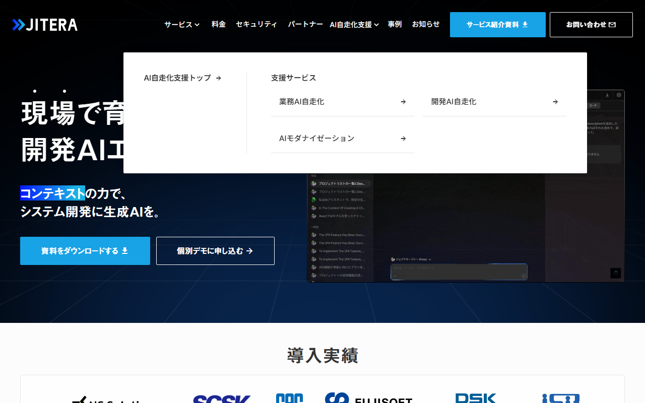 株式会社Jiteraが提供する「Jitera」は、コンテキストの力でシステム開発を効率化するAI開発プラットフォームです。GitHubリポジトリ、ドキュメント、Google Driveなどと連携し、AIがコードベースの文脈を理解した上で設計書・コード生成・ドキュメント作成・QAテストまでを一気通貫で支援します。他社比3倍速・高品質開発を実現しており、セキュリティ要件が厳しいエンタープライズ企業への導入実績があります。