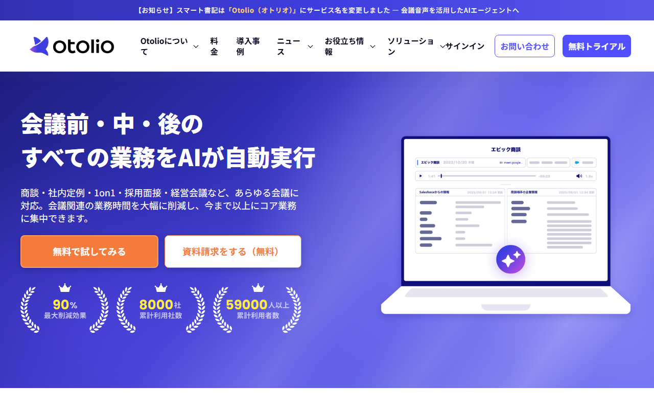 エピックベース株式会社が提供する「Otolio」は、会議音声を活用したAIエージェントサービスです。旧「スマート書記」から2025年11月に名称変更されました。会議前の資料準備から、会議中のリアルタイム文字起こし・要約、会議後のタスク整理・議事録共有まで、会議にまつわる業務全般を自動化します。Salesforce連携による商談フォロー自動化にも対応し、累計8,000社以上・59,000人以上に導入実績があります。