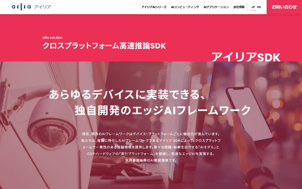 アイリア株式会社が提供する「ailia SDK」は、あらゆるデバイスに実装できる独自開発のエッジAI推論フレームワークです。VulkanとMetalを活用したGPU/CPU両対応の高速推論を実現し、Windows・Android・Linux・iOS・Macのクロスプラットフォームに対応しています。390種類以上の事前学習済みモデルライブラリを提供し、モデルの圧縮・暗号化機能も備えています。通信・自動車・ゲーム業界などで活用されています。