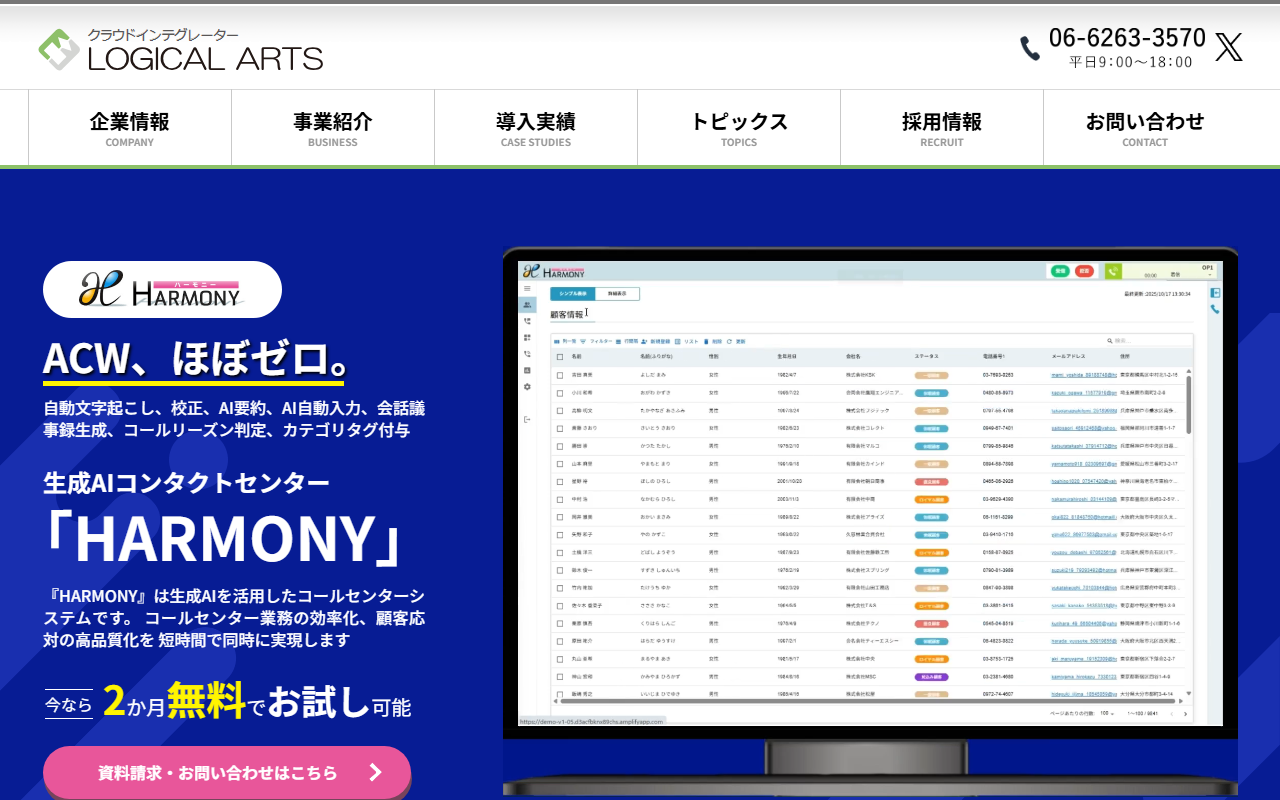ロジカル・アーツ株式会社が提供する「HARMONY」は、生成AIを活用したクラウド型コールセンターシステムです。Amazon Connectをベースに開発されており、通話内容のリアルタイム文字起こし・校正・要約・会話議事録生成・自動入力・コールリーズン判定・カテゴリタグ付与の7つのAI機能を搭載しています。専用ソフトフォンやCRMデータ連携にも対応し、2か月無料お試しキャンペーンも実施しています。
