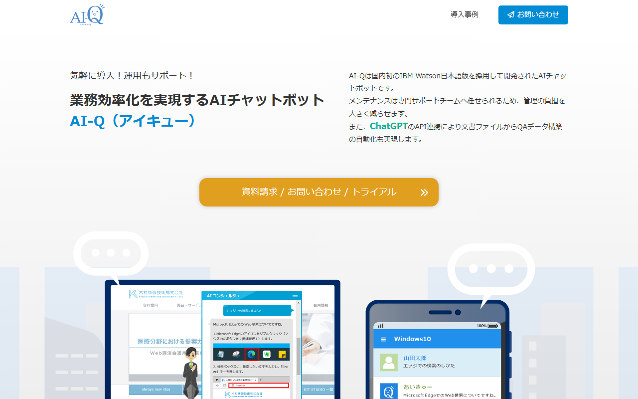 木村情報技術株式会社が提供する「AI-Q」は、IBM Watson日本語版を採用して開発されたAIチャットボットサービスです。1つの契約で複数カテゴリに対応できるマルチカテゴリ型システムを採用しており、各部門ごとに独立したAIエンジンを展開可能です。ChatGPTとのAPI連携により文書ファイルからQAデータを自動生成する機能を搭載し、チャットボット構築時間を最大80%削減します。日経、京セラ、パナソニック保険サービスなど大手企業への導入実績があります。