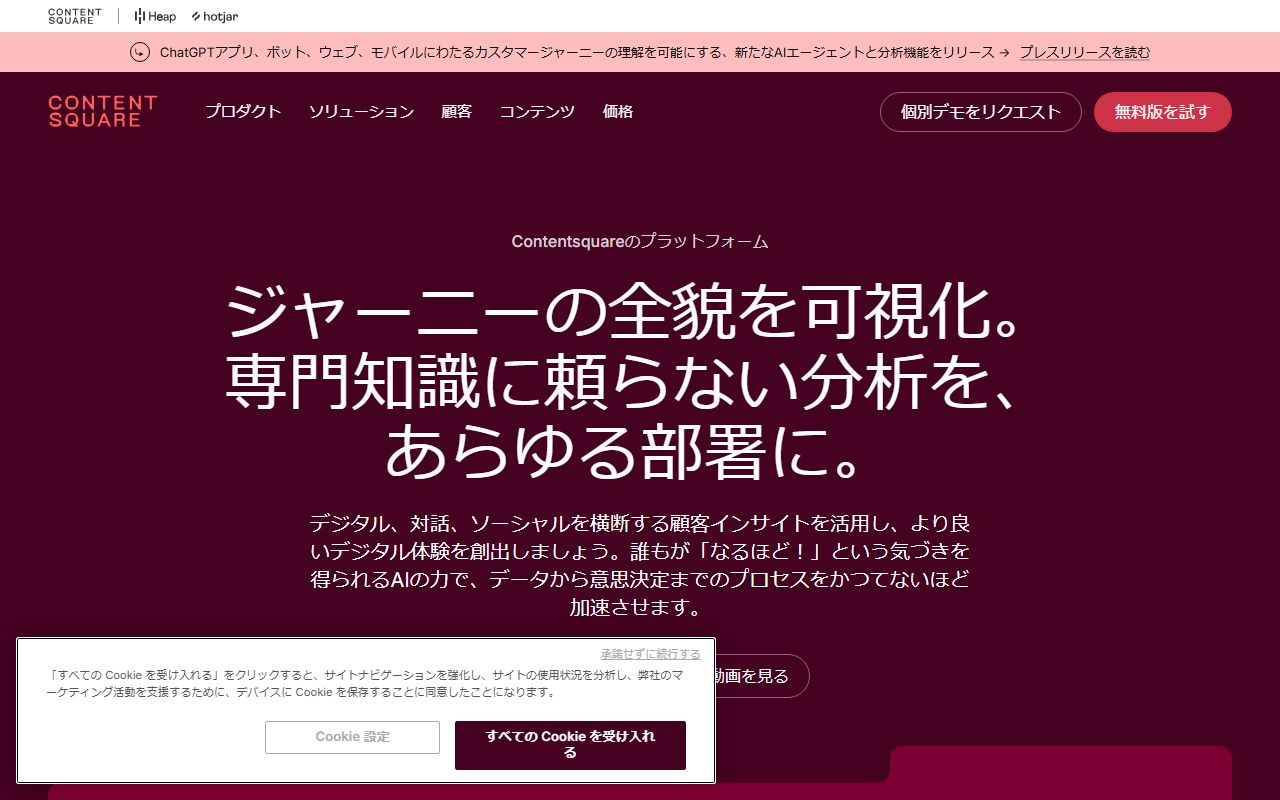 Contentsquare Japan合同会社が提供する「Contentsquare」は、AIを活用したデジタル顧客体験分析プラットフォームです。Webサイト・モバイルアプリ・AIエージェントを横断するカスタマージャーニーを可視化し、ユーザー行動をヒートマップやセッションリプレイで詳細に分析できます。新機能としてAIエージェント分析、ChatGPTプロンプト分析、LLM・ボットの可視化、会話分析を搭載しており、AI主導の顧客体験を包括的に把握できます。EC・小売・金融など幅広い業種のマーケティング担当者やUXチームに活用されており、コンバージョン率の改善やカスタマーサポートの最適化を支援しています。