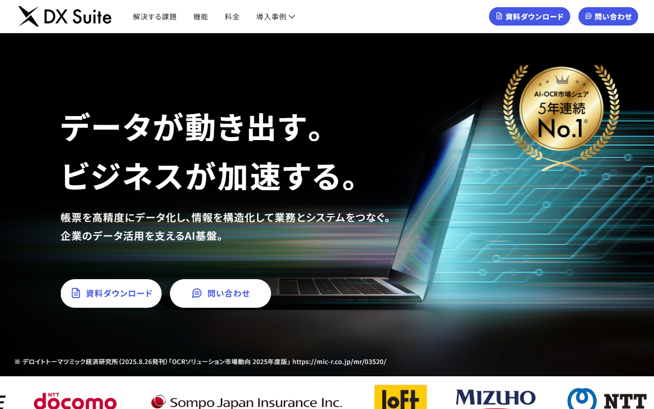 DX Suiteは、AI inside株式会社が提供するAI-OCR市場シェアNo.1のクラウド型帳票デジタル化サービスです。申込書・請求書・契約書・手書き書類・FAXなど多様な帳票を99.6%の高精度で自動読み取りし、データ構造化から業務システムとの連携までを一貫して支援します。独自のAI技術「PolySphere-4」を採用しており、累計読取実績100億回超・継続率99.43%・導入契約3,000件以上の実績を誇ります。2025年からはAIエージェント機能を標準搭載し、人とAIが協働する次世代の業務体験を提供しています。