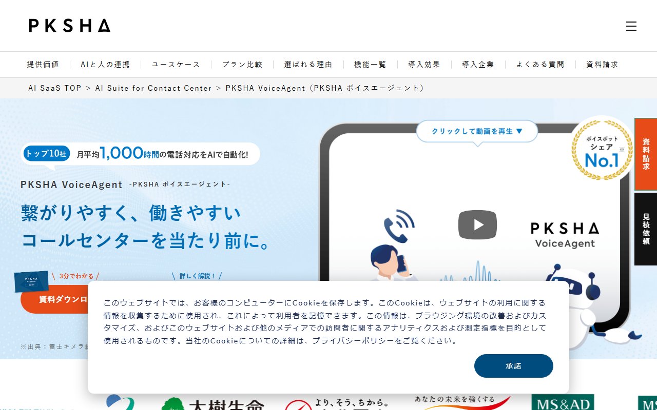 PKSHA VoiceAgentは、株式会社PKSHA Technologyが提供するコールセンターの電話対応をAIで自動化するボイスエージェントサービスです。音声認識市場でボイスボット売上シェアNo.1(市場シェア24.7%)を誇り、高精度な日本語音声認識と業界特有の専門用語にも対応しています。ノーコードで対話フローを作成できるため、非技術者でも自律的な音声応答シナリオを構築・改修できます。主要PBX/CTIシステムや外部データベースとの連携に対応し、インバウンドとアウトバウンドの双方に活用できます。24時間365日の無人対応を実現し、オペレーターの業務負荷軽減と顧客体験向上を同時に達成します。