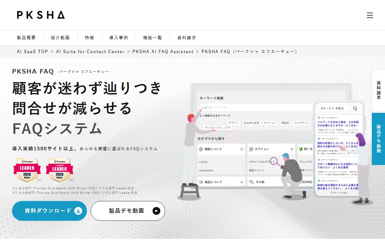 PKSHA FAQは、株式会社PKSHA Technologyが提供する導入実績1,500サイト以上を持つナレッジマネジメント型FAQシステムです。キーワード検索・カテゴリ・タグ・サジェスト・ランキング表示など豊富な探索機能でユーザーが必要な情報に素早くたどり着けます。顧客向けFAQ・社内ナレッジ・応対ログを一元管理し、分散していた情報を集約して常に最新状態に保ちます。社内ドキュメントからのFAQ自動生成やAIによる重複確認・回答自動生成機能で運用負荷を大幅に軽減します。ブランドに合わせたデザインカスタマイズも可能です。