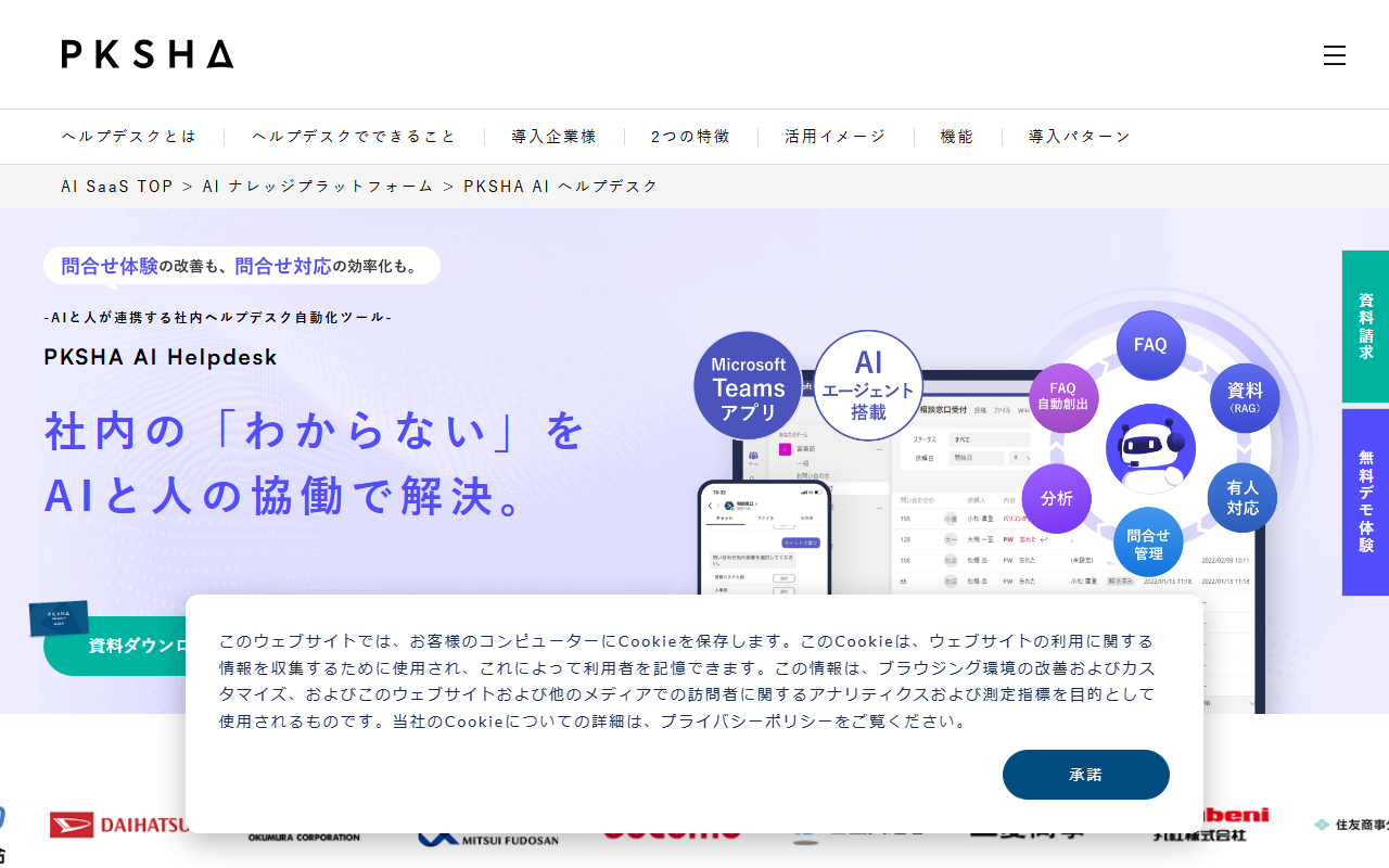 PKSHA AI Helpdeskは、株式会社PKSHA Technologyが提供するMicrosoft Teams上でAIと人が連携して社内問い合わせを解決するエンタープライズ向けAIヘルプデスクサービスです。FAQエージェントによる即時自動回答・SharePointドキュメントをRAGで参照する回答生成・人へのエスカレーションという3段階の解決プロセスを実現します。対話履歴を自動分析してFAQを自律生成する自己学習機能を備え、運用を続けるほど回答精度が向上します。導入実績では月間2,000件の電話問い合わせをゼロにした事例もあります。