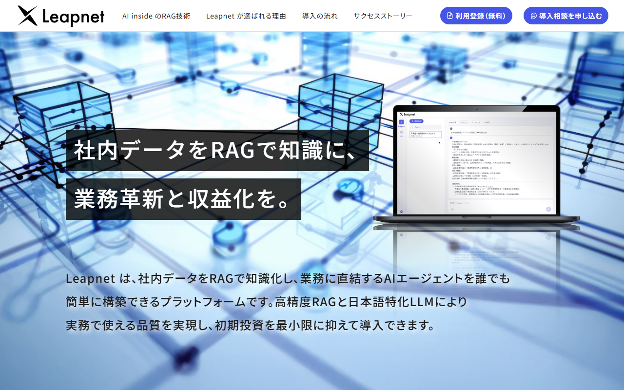 Leapnetは、AI inside株式会社が提供するRAG/AIエージェント構築プラットフォームです。PDF・CSV・画像・音声・動画など多様な形式の社内データをアップロードするだけで、独自の高精度RAG基盤が自動的に検索可能な知識に変換します。プログラミング不要の自然言語指示でAIエージェントを構築でき、生成されたエージェントはAPIとして即時展開が可能です。日本語特化LLM「PolySphere」を採用し、生成・要約・分類・抽出など多様な処理に対応しています。企業が自社知見をもとにAIエージェントを開発するAIプロバイダーとしての収益化も支援します。