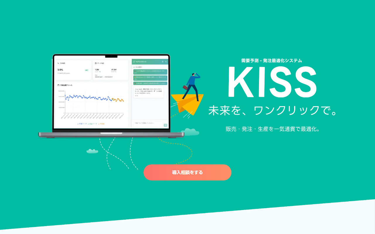 株式会社メロンが提供する「KISS」は、多数の特許技術を搭載した在庫最適化AIです。「未来を、ワンクリックで。」をコンセプトに、需要予測から発注計画、生産計画までをAIが一気通貫で最適化し、在庫の過不足を解消します。販売予測・在庫補充・出店戦略までをカバーする包括的なソリューションで、小売・製造業を中心に機会損失の抑制と在庫コストの削減を同時に実現します。データ活用による意思決定の高度化を支援しています。