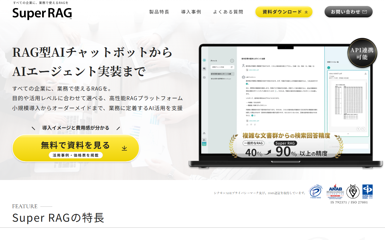 株式会社シナモンが提供する「Super RAG」は、社内情報を即座に検索・回答するエンタープライズ向けRAGプロダクトです。社内に散在するドキュメント・マニュアル・ナレッジを横断的に検索し、自然言語での質問に対して根拠資料とともに正確な回答を返します。独自のドキュメント解析技術とLLMを組み合わせることで高い検索精度を実現しています。問い合わせコストの削減とナレッジ活用の最大化を同時に達成するソリューションです。