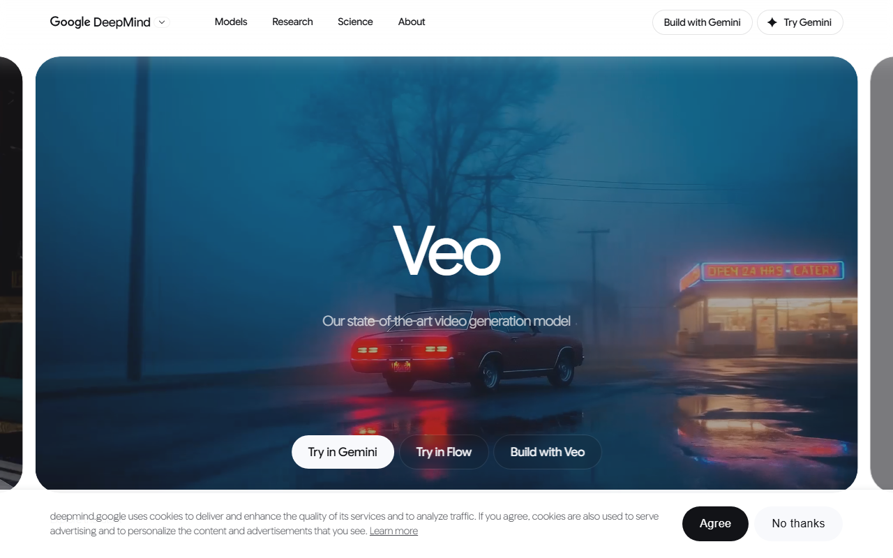 Google DeepMindが開発した「Veo」は、テキストや画像から音声付きの高品質動画を生成するAIモデルです。最新のVeo 3では映像と音声を単一モデルで統合処理し、雷の映像と音を同期させるなど自然で矛盾のない動画生成を実現しています。Geminiアプリ経由で利用でき、Google AI Plus(月額1,200円)から利用可能です。Ultraプラン(月額36,400円)ではVeo 3 Fastがほぼ無制限で利用できます。Runway・Pika等の動画生成AIと競合するGoogleの動画生成ソリューションです。