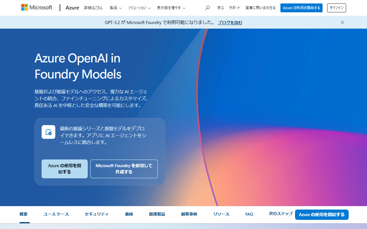Microsoftが提供する「Azure OpenAI Service」は、OpenAIの最新モデル(GPT-5系、DALL-E、Whisper等)をAzureのエンタープライズ基盤上で利用できるクラウドAIサービスです。VNet統合・プライベートエンドポイント・PII検出・プロンプトインジェクション対策など企業向けセキュリティ機能が充実しており、入力データがモデル学習に使用されないことが保証されています。従量課金制(トークン単位)と予約型(PTU)の料金体系があり、Microsoft Foundryによる統合開発環境も提供されています。