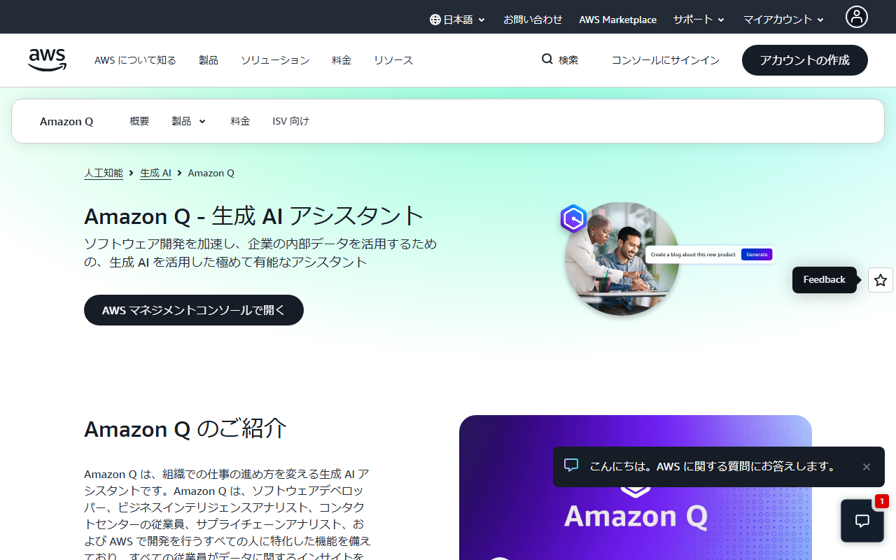 AWSが提供する「Amazon Q」は、開発者向けとビジネスユーザー向けの2つのサービスで構成される企業向けAIアシスタントです。Amazon Q Developerはコード生成・デバッグ・AWSリソース管理を支援し、Amazon Q Businessは社内データソースと連携したRAGアプリケーションを自然言語で構築できます。入力情報がモデル学習に使用されないセキュリティ設計で、機密性の高い業務にも対応しています。Developer Pro(月額19ドル/ユーザー)とBusiness向けプランが用意されています。