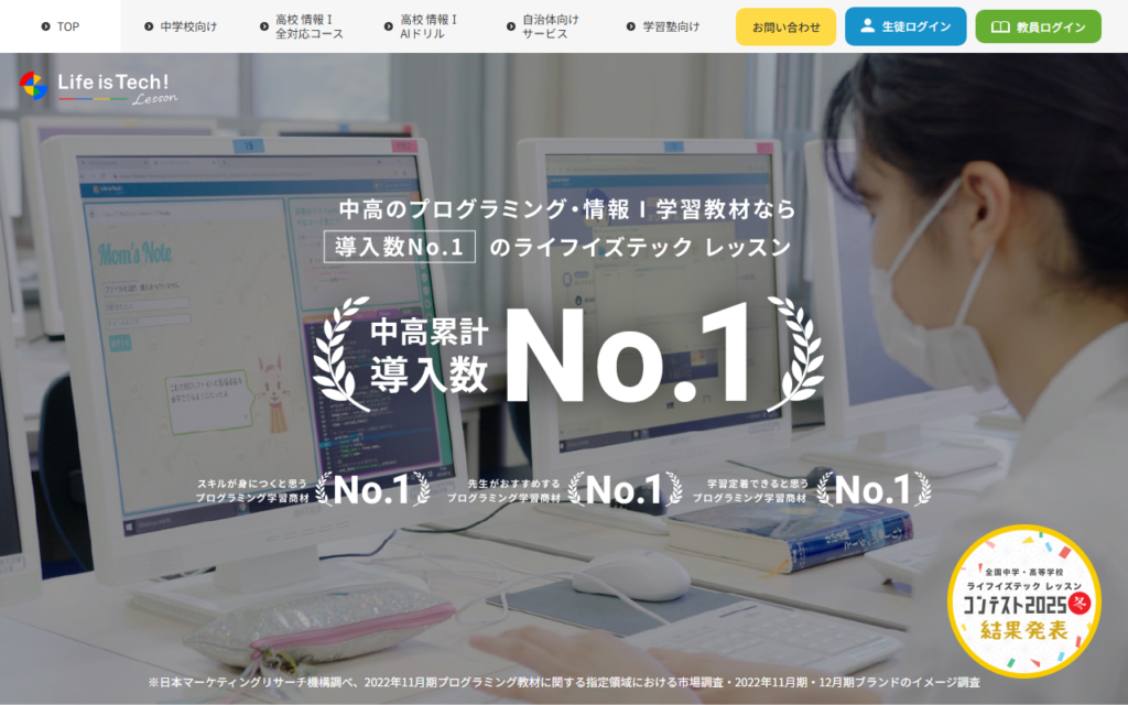 Life is Tech! Lessonは、中学校・高校向けのAI・プログラミング学習教材です。ブラウザ上で動作するインタラクティブな教材で、生徒一人ひとりの進度に合わせた個別最適化された学習体験を提供します。情報Iの全単元に対応したカリキュラムを備え、プログ... -