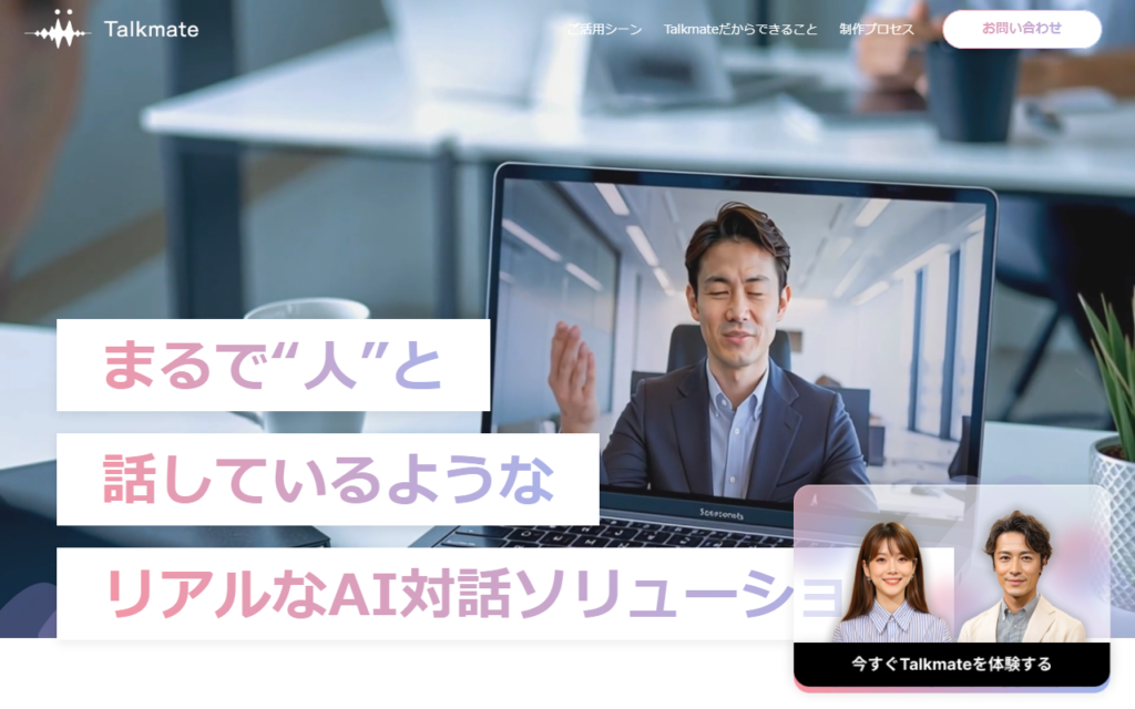 株式会社エボルブが提供する「Talkmate」は、リアルタイム対話型AIアバターソリューションです。自然な音声・表情・ボディランゲージを持つAIアバターと24時間365日いつでも会話でき、業務ドキュメントを事前に学習させることで正確な情報提供が可能です。... -