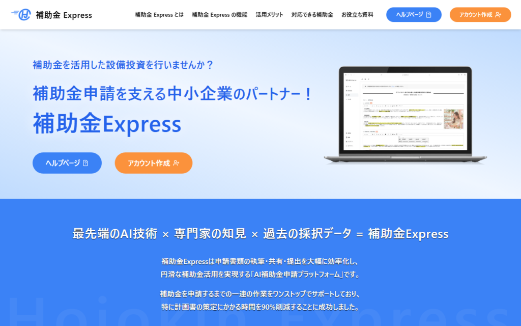 補助金Expressは、株式会社2WINSが提供するAIを活用した補助金申請支援プラットフォームです。小規模事業者持続化補助金やものづくり補助金に対応しており、AIが計画書類の作成を半自動化することで作成時間を80〜90%削減します。補助金事務局の電子申請シ... -