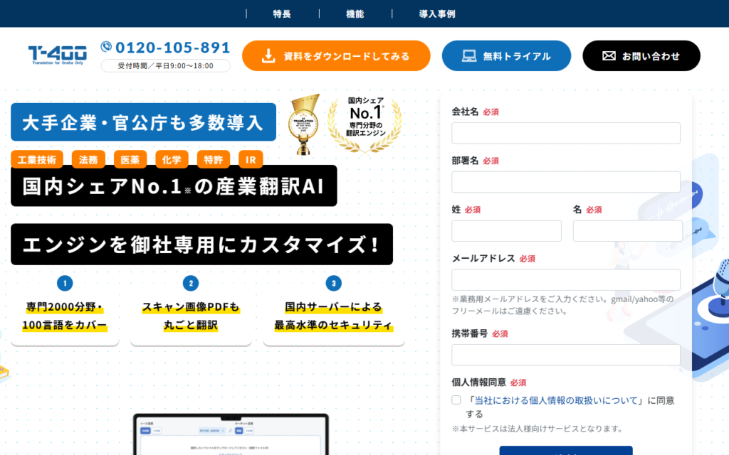 株式会社ロゼッタが提供する「T-4OO」は、2,000以上の専門分野・100言語に対応した高精度AI翻訳サービスです。LLMを活用した独自アルゴリズムにより最大95%の翻訳精度を実現し、従来のNMTモデルより自然な文脈表現が可能です。PDF・Word・Excel・PowerPoin... -