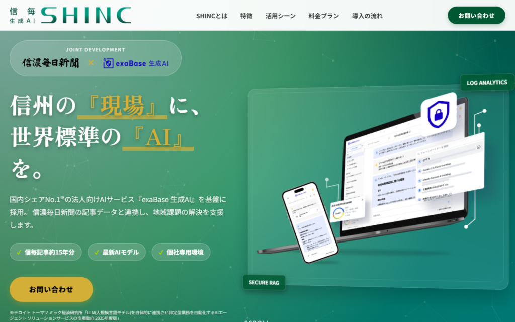 信濃毎日新聞株式会社とExaWizardsが共同開発した法人・自治体・教育機関向け生成AIサービスです。150年の新聞発行で蓄積した信毎記事約15年分のデータベースをRAGとして活用し、信州の現場に根ざした独自の情報提供を実現します。ChatGPT・Gemini・Claude... -